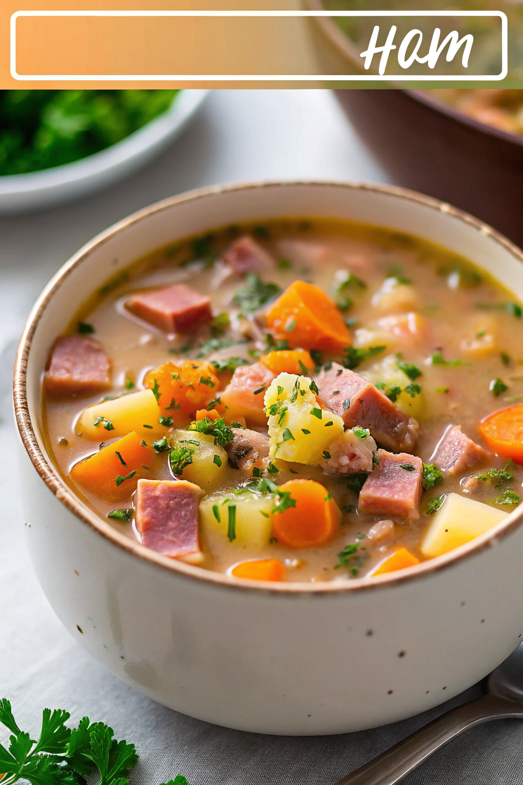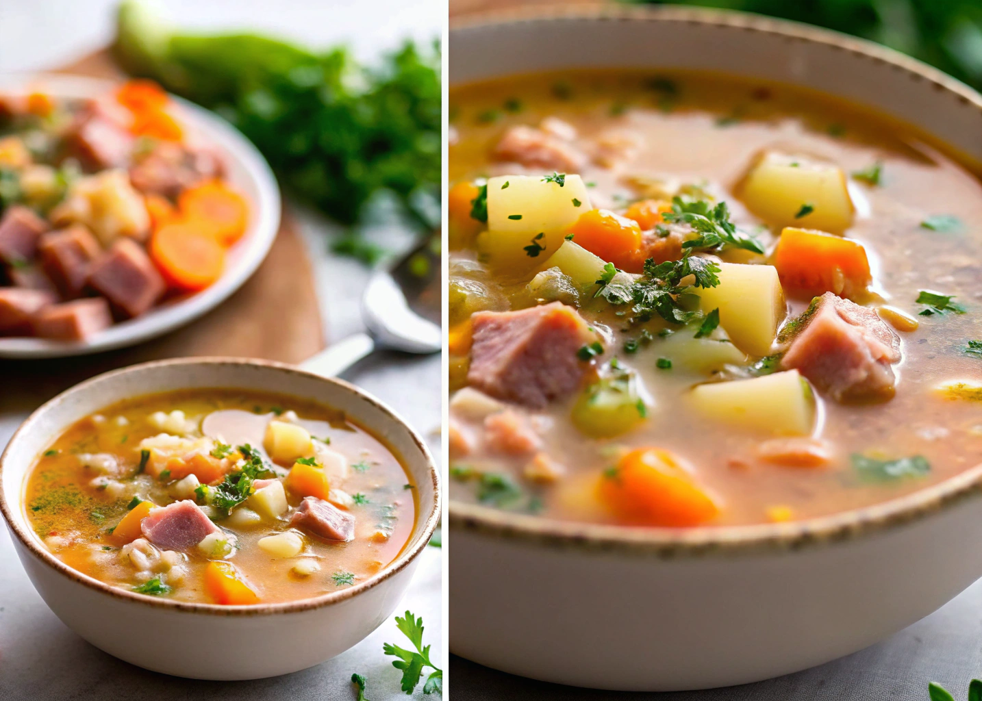 The combination of tender ham, vegetables, and rich broth makes each spoonful an absolute delight.